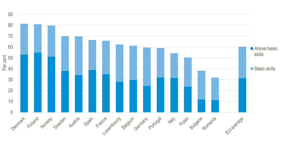 Each year, the European Commission compares the digital skills among citizens in the European countries. The skills measured are skills such as sending and receiving emails, finding information online, using software to write texts and process data, using online banking and protecting personal online data. In 2025, Denmark took an overall first place in terms of citizens with either “basic" or “above basic" digital skills. The two groups accounted for 28 and 53 per cent respectively of the population in Denmark. The EU average was 29 per cent and 31 per cent respectively.